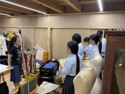 衣装部屋で、衣装担当のスタッフへ質問。置いてある衣装を作っているのか、どんなふうに管理しているのかなどを教えてもらいました。たくさんの衣装が並ぶ様子に、生徒さんたちも興味津々。