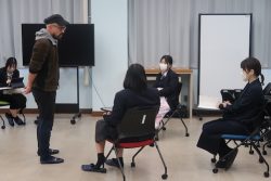 青谷高校の授業最終回です。これまでに取り組んできた作劇やディベートの要素を組み合わせた内容で行われました。今回のテーマは「自己紹介」。ただし、実在の自分ではなく、架空の転校生として前に立つという設定です。